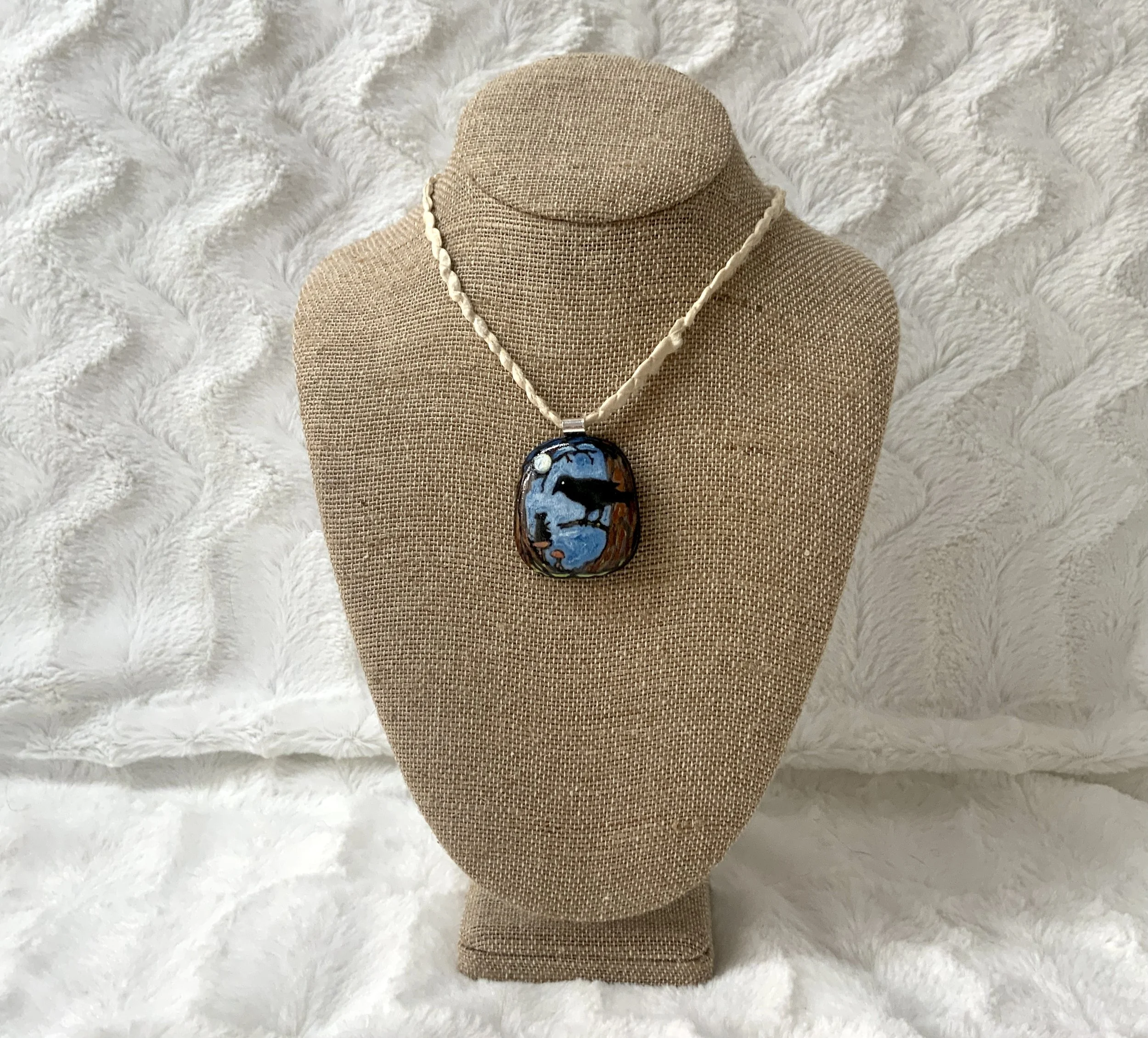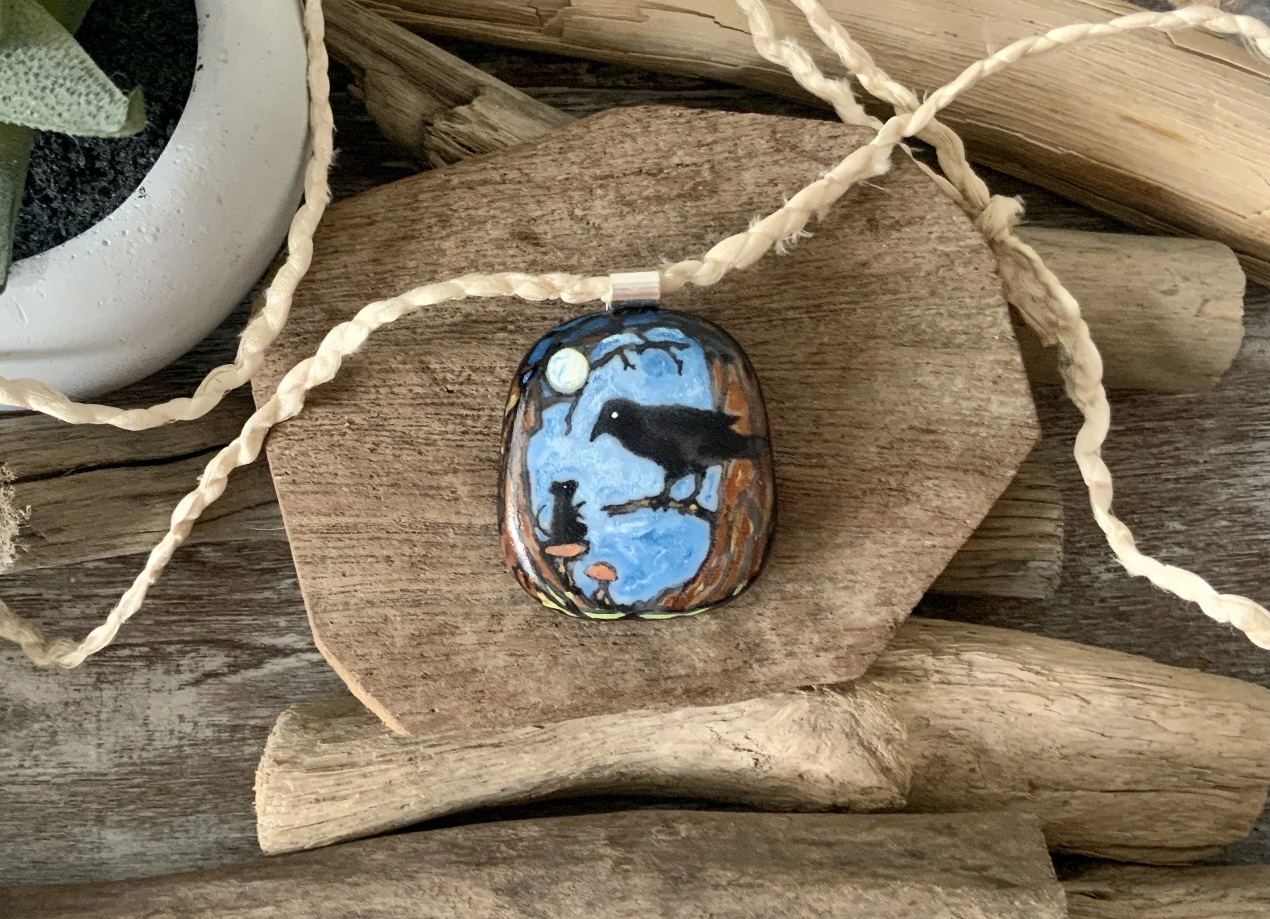 Overture, story, raven, mouse, forest , moon, fused glass, art, pendant, necklace