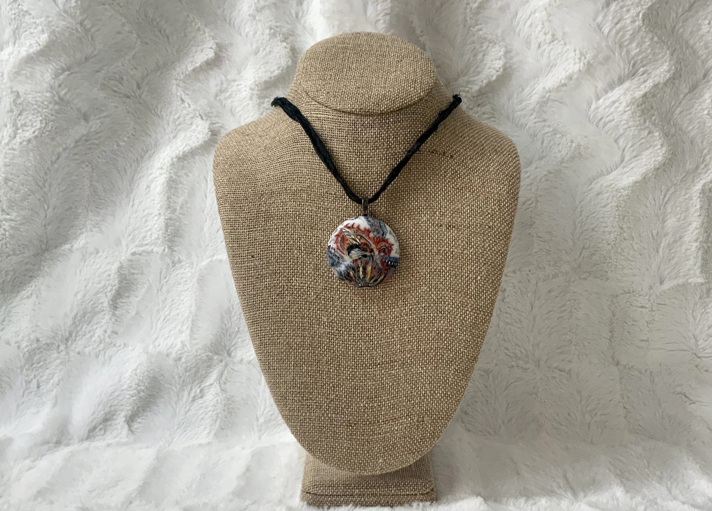 This fused glass, pendant necklace, Reine, is a one-of-a-kind work of art. Created with love and care from hand-selected pieces of high-quality glass, and then melted in a kiln to reveal the unique character of the glass, this piece displays a majestic hand painted queen bee sitting among her kingdom with its rich tapestry of golden flowers sunset orange paisley and bands of soft dove gray, only a true queen is able to wear this work of art with grace and dignity. 1.5× 1.5 inches